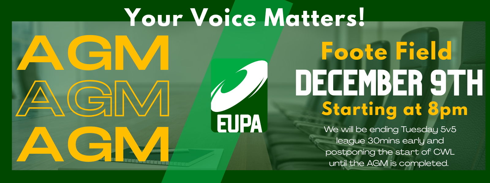 To ensure our members have the opportunity to share their voice and help shape the future of EUPA, our AGM has been rescheduled to December 9 at Foote Field.